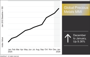 The Global Precious Metals MMI (Monthly Metals Index) once again experienced a month-over-month rise, this time increasing by 9.36%.