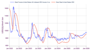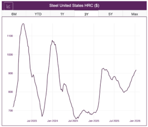 Roughly one year ago, incoming tariffs sent the market into a frenzy as buyers stocked up before the duties went into effect at the start of Q2 2025. This resulted in HRC prices peaking at $927/st on March 28 before reversing to the downside over the following two quarters. However, mills regained control over the price trend by the start of Q4, allowing them to tighten supply through maintenance outages and capacity cuts.
