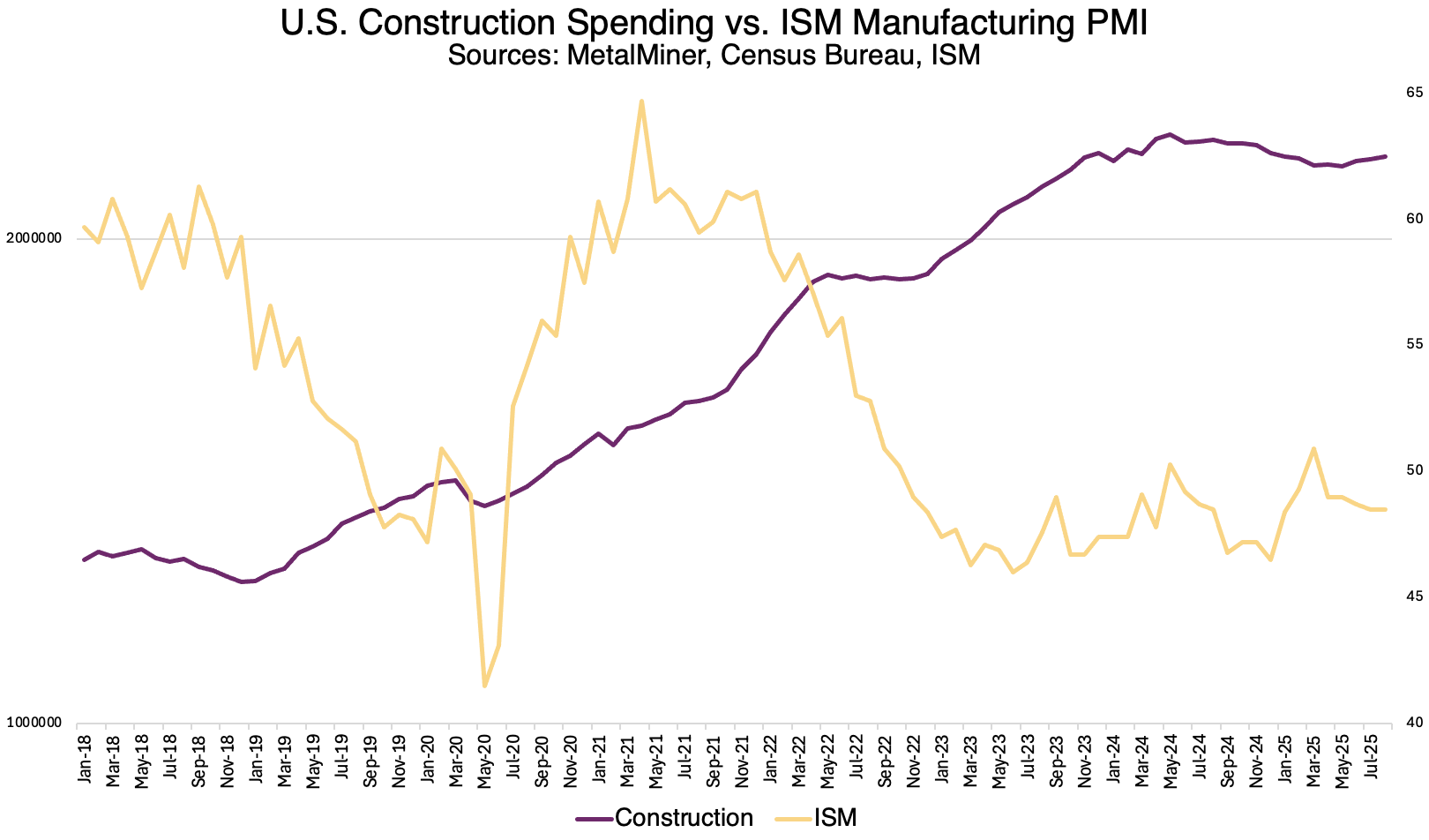 While tariffs have helped U.S. mills considerably, demand has not strengthened. The manufacturing sector has yet to return to growth, trending deeper into contraction over recent months. Meanwhile, even with recent, albeit modest, increases in spending, U.S. construction spending remains considerably lower than where it stood the previous year.