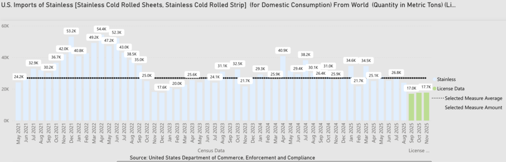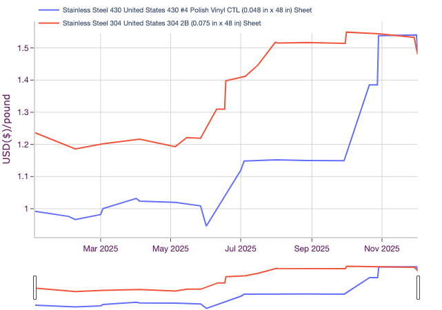 Recent Federal Reserve rate cuts will provide some support to markets. However, when that becomes apparent in major end-use sectors and when that will translate to a rebound in the U.S. manufacturing sector remains uncertain, particularly amid a weakening labor market. The U.S. construction industry will see new demand from U.S. infrastructure efforts and the ongoing growth of data center investments in 2026, but market sources appeared skeptical that this will offset weakness elsewhere in stainless demand.